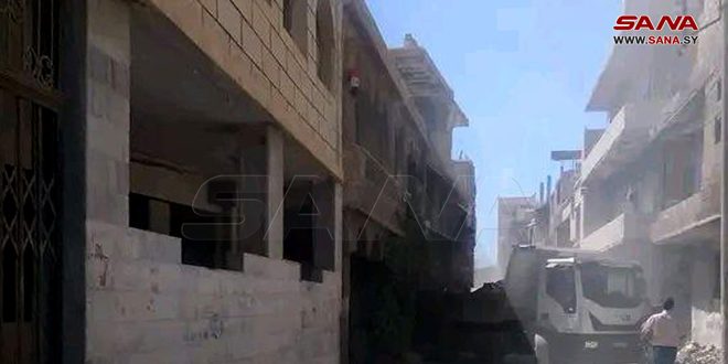 تواصل ورشات وآليات مديريتي الخدمات الفنية وإدارة النفايات الصلبة بالقنيطرة أعمال ترحيل الأتربة والأنقاض وفتح الشوارع الرئيسية والفرعية في حيي تشرين والثورة في تجمع الحجر الأسود للنازحين بريف دمشق.