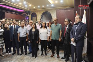 افتتح الحفل بالنشيد العربي السوري والوقوف دقيقة صمت إجلالاً لأرواح شهدائنا الأبرار بحضور وزير الإعلام الدكتور بطرس الحلاق ومعاون الوزير أحمد ضوا وعدد من السفراء ورؤساء وأعضاء البعثات الدبلوماسية المعتمدين بدمشق ومديرة إدارة الإعلام بوزارة الخارجية وريف الحلبي ورئيس لجنة دعم الشعب الفلسطيني الدكتور صابر فلحوط.