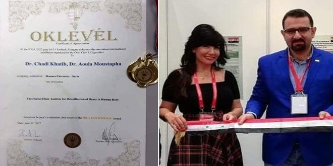 حصل الباحثان السوريان الدكتور شادي خطيب والدكتورة علا مصطفى عضواً الهيئة التدريسية في كلية الصيدلة بجامعة المنارة على الميدالية الذهبية في المعرض الدولي للاختراع والابتكارات في هنغاريا “أي دي أي ا” 2022 عن براءة اختراع مسجلة لهما عالمياً في مجال العلاج بالأعشاب الطبية السورية ليضاف هذا الإنجاز إلى جملة من الجوائز العالمية وبراءات الاختراع التي حصل عليها الباحثان في المجال نفسه.