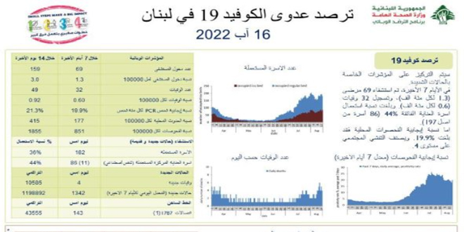 وذكرت الوزارة في بيان لها اليوم أن العدد الإجمالي للإصابات بالفيروس في لبنان ارتفع إلى 1198892 إصابة بينما وصل مجموع الوفيات إلى 10585 حالة وفاة.