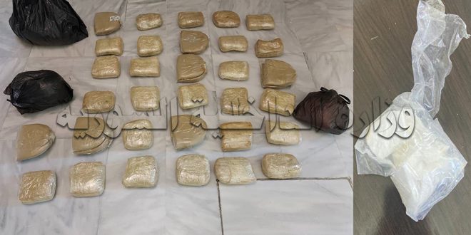 وأوضحت وزارة الداخلية في بيان تلقت سانا نسخة منه أنه وفي إطار المتابعة المستمرة تمكن فرع مكافحة المخدرات بدمشق من القبض على تاجر مخدرات أثناء قيامه بنقل كمية 30 كيلوغراماً من مادة الحشيش المخدر من مضايا بريف دمشق.