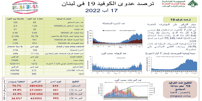 وذكرت الوزارة في بيان لها اليوم أن العدد الإجمالي للإصابات بكورونا في لبنان ارتفع إلى 1200111 إصابة بينما بلغ مجموع الوفيات 10589 حالة وفاة.