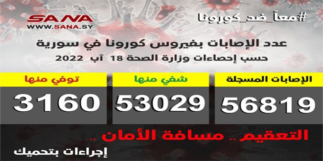 وأوضحت الوزارة في بيان تلقت سانا نسخة منه أن عدد الإصابات المسجلة في سورية بلغ حتى الآن 56819 شفي منها 53029 حالة وتوفي 3160 حالة.
