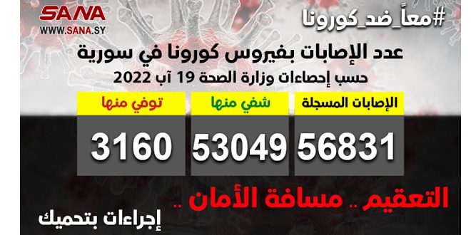 وأوضحت الوزارة في بيان تلقت سانا نسخة منه أن عدد الإصابات المسجلة في سورية بلغ حتى الآن 56831 شفي منها 53049 حالة وتوفي 3160 حالة.