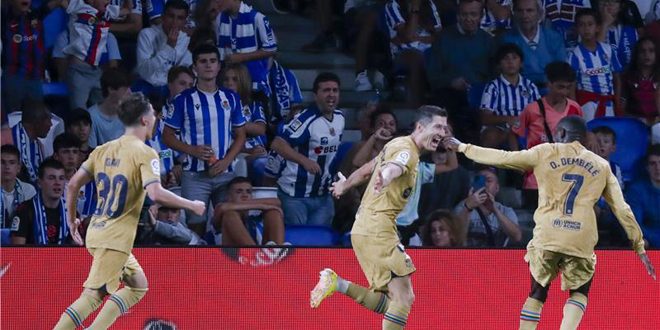 فاز فريق برشلونة على ريال سوسيداد بأربعة أهداف مقابل هدف واحد في المباراة التي جمعتهما ضمن منافسات الجولة الثانية من الدوري الاسباني لكرة القدم (الليغا).