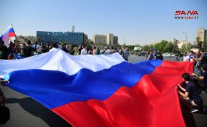في إطار مشاركة الشعب الروسي احتفالاته بعيد العلم الروسي شهدت ساحة الأمويين بدمشق احتفالية تضمنت عدة نشاطات رفع خلالها علم كبير لروسيا الاتحادية وعشرات الأعلام السورية والروسية.