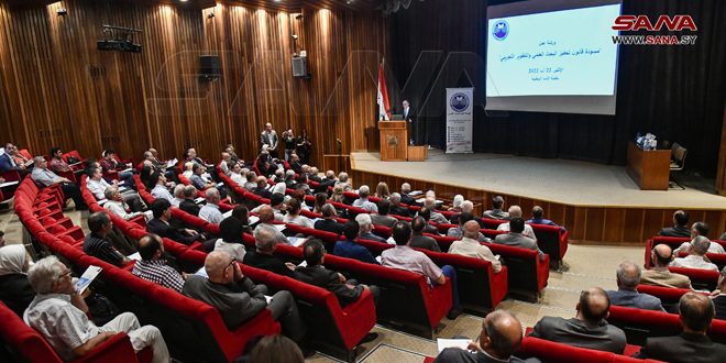 وقدم الدكتور مجد الجمالي مدير عام الهيئة العليا للبحث العلمي عرضاً حول بعض الأسباب الموجبة لإصدار القانون ودور المؤسسات الداعمة في هذا المجال والمراجع المستخدمة في وضع مسودة القانون مشيراً إلى أهميته من ناحية تطوير نظام التعاقد مع الباحثين واستثمار مخرجات البحث العلمي والتطوير التجريبي وتحديد مهام الباحثين وحقوقهم وواجباتهم والأمور المتعلقة بتمويل نشاطات البحث العلمي والتطوير التجريبي وحوافز الإنتاج البحثي.