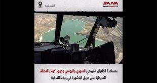 بمساعدة من الطيران المروحي السوري والروسي وبجهود من كوادر إطفاء الحراج في مديرية زراعة اللاذقية تم اليوم إخماد الحريق الكبير الذي نشب ضمن المناطق الحراجية ذات الطبيعة الجبلية في باشورة بريف اللاذقية الشمالي.