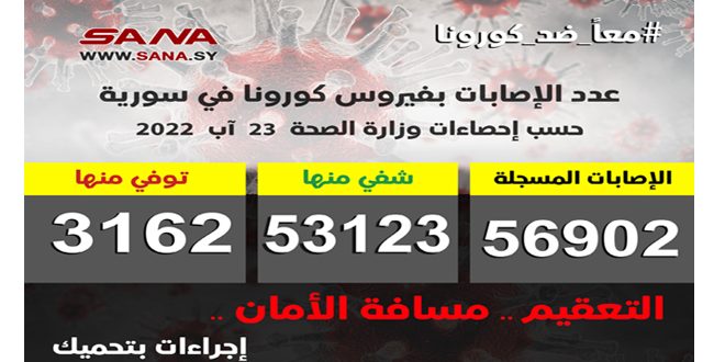 وأوضحت الوزارة في بيان تلقت سانا نسخة منه أن عدد الإصابات المسجلة في سورية بلغ حتى الآن 56902 شفي منها 53123 حالة وتوفي 3162 حالة.