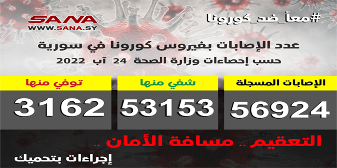 وأوضحت الوزارة في بيان تلقت سانا نسخة منه أن عدد الإصابات المسجلة في سورية بلغ حتى الآن 56924 شفي منها 53153 حالة وتوفي 3162 حالة.