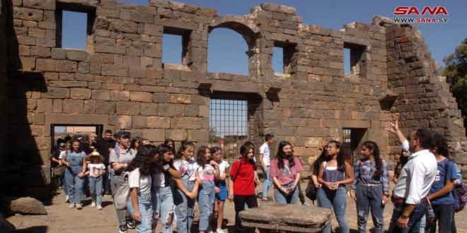 رئيس دائرة آثار السويداء وليد أبو رايد أوضح لمراسل سانا أنه في إطار تواصل أنشطة مبادرة حجر وأثر التي أطلقها مركز الشباب في منظمة المعهد الأوروبي للتعاون والتنمية بالسويداء ودائرة الآثار جرى تنظيم زيارة ميدانية علمية لطلاب من مدرسة الشهيد رامي العشعوش للتعليم الأساسي بالتعاون مع مديرية التربية لتعريفهم بأهمية الآثار وضرورة الحفاظ عليها وإعطائهم لمحة تاريخية عن حضارة المنطقة مع محاضرة عن متحف السويداء الوطني ومحتوياته التي تعود لمختلف العصور.