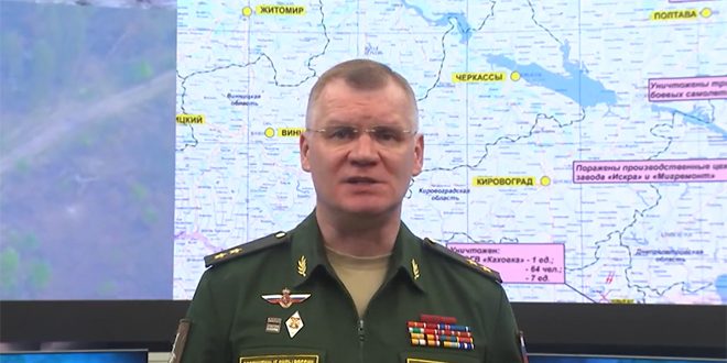 وقال المتحدث باسم وزارة الدفاع الروسية الفريق إيغور كوناشينكوف في إحاطة صحفية اليوم “إن أسلحة عالية الدقة للقوات الجوفضائية الروسية أصابت مطار ميرغورود العسكري بمنطقة بولتافا الذي يضم خمس طائرات مقاتلة تابعة للقوات الجوية الأوكرانية ما أسفر عن تدمير واحدة من طراز سو27 وأخرى من طراز سو24 فيما تضررت طائرتان أخريان من طراز سو24 إس وسو24 بشدة وبلغت الخسائر في القوى البشرية 30 متطرفاً”.