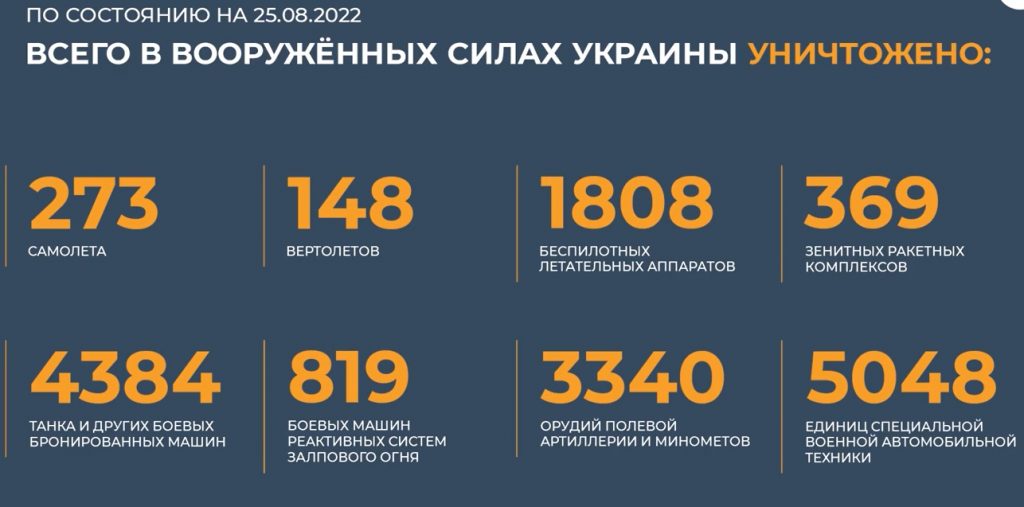 وبين كوناشينكوف أنه منذ بداية العملية العسكرية الخاصة تم إجمالاً تدمير 273 طائرة و148 طائرة مروحية و1808 طائرات مسيرة و369 منظومة صواريخ مضادة للطائرات و4384 دبابة ومركبة قتالية مصفحة أخرى و819 مركبة قتالية لراجمات الصواريخ و3340 مدفع ميدان وهاون وكذلك 5048 وحدة من المركبات العسكرية الخاصة.