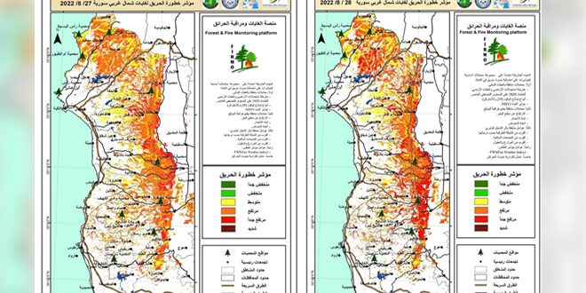 حذرت منصة الغابات ومراقبة الحرائق (فيرمو) من احتمال تأثر معظم مواقع غابات شمال غرب سورية اليوم بمستوى خطورة مرتفع للحرائق وارتفاع التأثير في مواقع محدودة تتسع رقعتها خلال يوم غد إلى مستوى الخطورة المرتفع جداً.