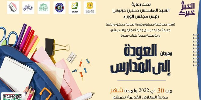 تنطلق بعد غد فعاليات (مهرجان الخير خيرك- العودة إلى المدارس) الذي تنظمه محافظة دمشق وغرف صناعة دمشق وريفها وتجارة دمشق وتجارة ريف دمشق وبصمة شباب سورية وذلك على أرض مدينة المعارض القديمة بدمشق ولمدة شهر كامل.