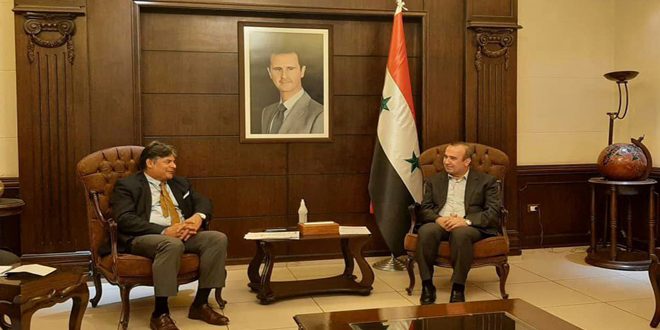 بحث وزير الإدارة المحلية والبيئة رئيس اللجنة العليا للإغاثة المهندس حسين مخلوف مع رئيس بعثة المفوضية السامية لشؤون اللاجئين في سورية سيفانكا دانا بالا اليوم مجالات التعاون الثنائية وسبل تطويرها وإمكانية المشاركة في دعم عملية العودة الآمنة للمهجرين واللاجئين السوريين إلى بلدهم.