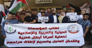 وشهدت أمس مدن عدة في الضفة الغربية بينها جنين وطوباس وبيت لحم والخليل وكذلك قطاع غزة المحاصر وقفات تضامنية مع الأسرى الفلسطينيين في معركتهم ضد السجان الإسرائيلي.