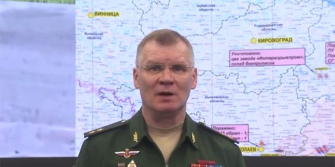 وقال الناطق: إنه في مدينة كريفوي روغ بمنطقة دنيبروبيتروفسك دمرت الأسلحة عالية الدقة التابعة لقوات الجو فضائية الروسية ورشات الإنتاج في مصنع انترفزريف بروم الذي كان ينتج المتفجرات وذخائر أخرى للقوات الأوكرانية.