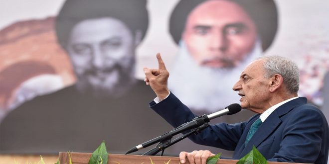 وقال بري في كلمة له في مدينة صور جنوب لبنان: “نؤكد دعمنا لسورية قيادة وجيشاً وشعباً” داعياً إلى تعزيز العلاقات مع سورية لما فيه مصلحة البلدين الشقيقين.