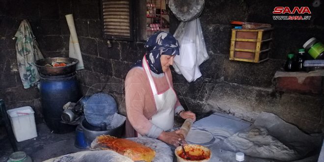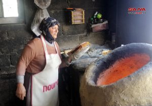 نعيمة ديوب أم دريد التي تعمل منذ أكثر من 25 عاماً في صناعة خبز التنور قالت لمراسلة سانا: إنها تستيقظ باكرا وتحضر التنور بحشوه بأغصان الأشجار الجافة بعدها تعمل على تحضير العجين وتقطيعه مبينة أنه لا يكاد يخلو أي بيت في القرية من تنور تصنعه النساء بأيديهن من الطين الممزوج بالتبن على مراحل ويترك للنار تحويله إلى فخار قاس تلتصق على حوافه الأرغفة سواء باليد أو باستخدام قطعة قماش تساعد على وقاية اليد من النار وزيادة مساحة رغيف الخبز.