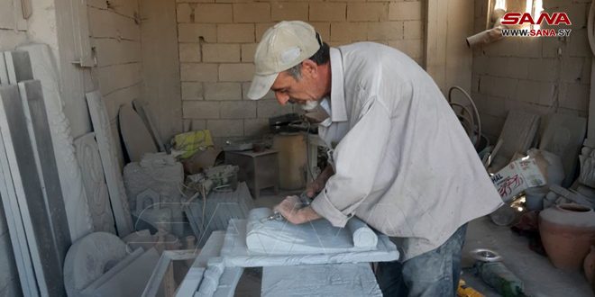 منحوتات بازلتية بمختلف الأحجام يقدمها النحات (سجيع سالم بدران) من بلدة الكفر بريف السويداء ضمن تجربة فنية عرفت انطلاقتها قبل نحو 15 عاماً.