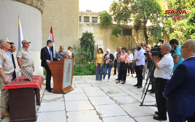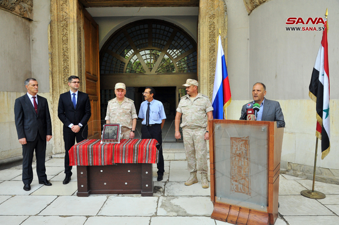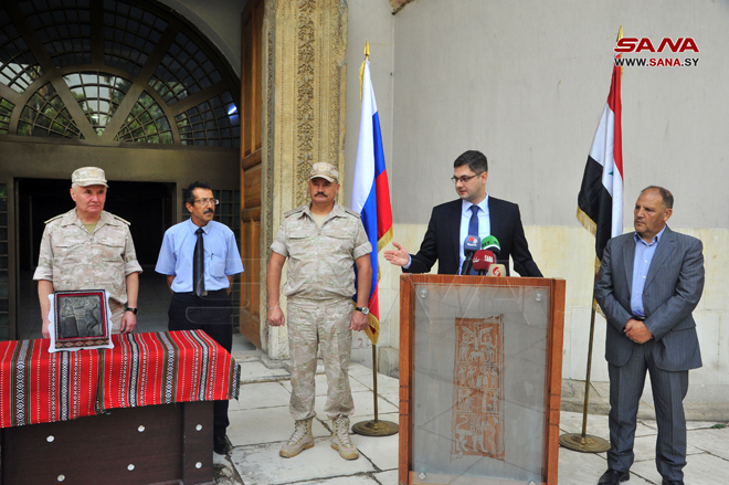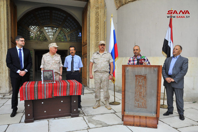 قائد الشرطة العسكرية الروسية في سورية الجنرال ديمتري شيربانوف قال: أثناء تسليم القطعة الأثرية “خلال وجودنا على الأرض السورية الخيرة لمسنا ماذا فعل الإرهاب بها من اعتداء وتطاول على آثارها ومقدساتها” مؤكداً أنهم عملوا على دثر معالمها التاريخية والإسلامية والمسيحية وكل شيء طالته أيديهم.