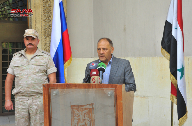 من جانبه القائم بأعمال سفارة روسيا الاتحادية في دمشق ايلدار قربانوف أشار إلى أهمية التعاون الثقافي باعتباره جزءاً مهما من التعاون الثنائي المشترك بين البلدين وهو يتمتع بأهمية قصوى لأن التاريخ والثقافة من أساسيات الحضارة السورية ولا سيما أنهما يتعرضان للسرقة والنهب موضحاً أنه بمساعدة القوات الروسية سوف يحرر الجيش العربي السوري الباسل كل الأراضي السورية من الإرهاب ويعيد ثرواتها التاريخية والثقافية.