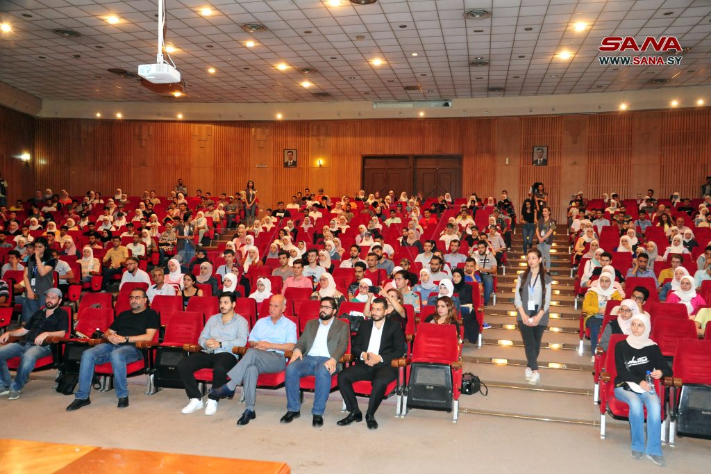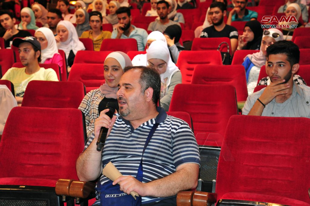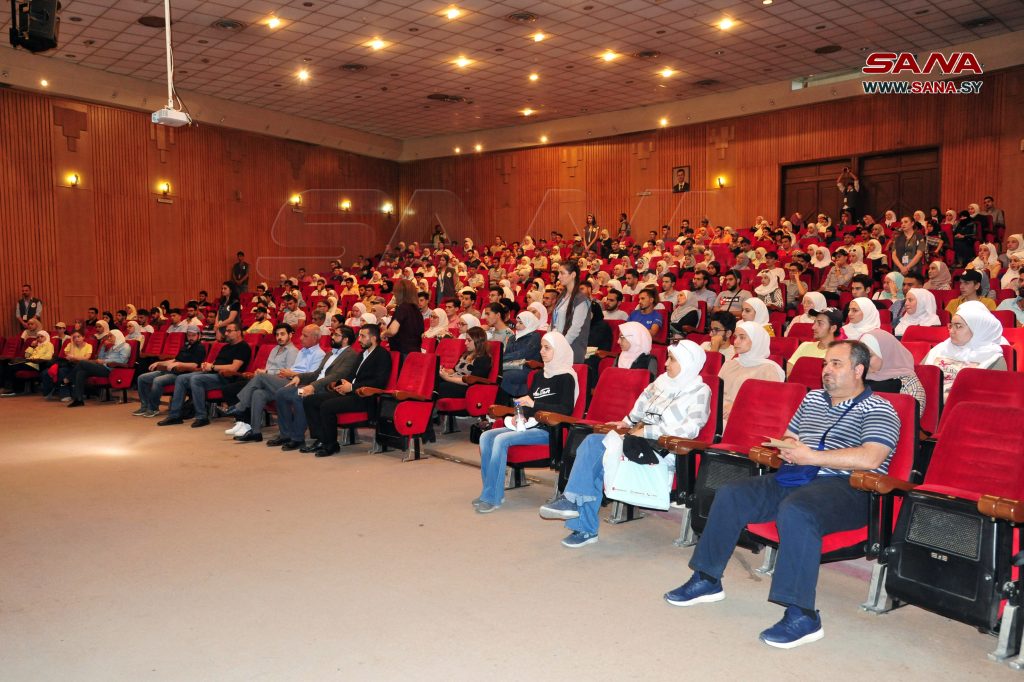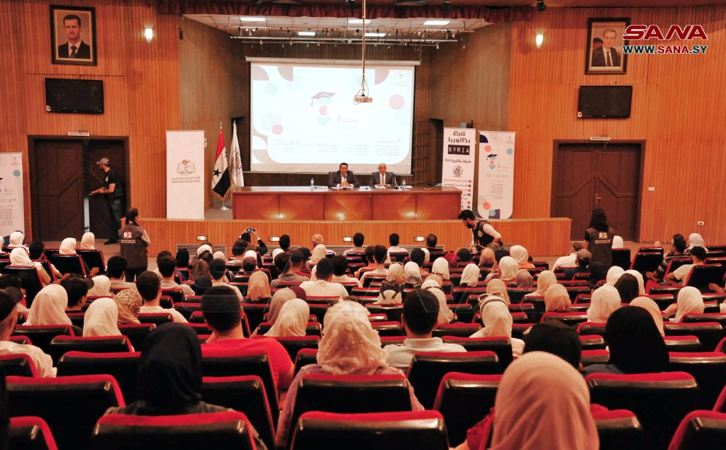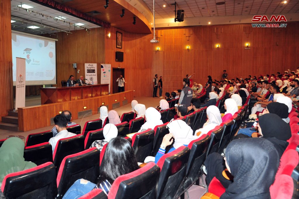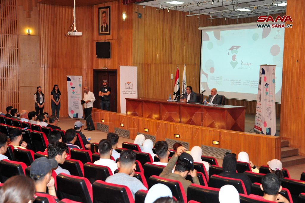 ضمن فعاليات معرض “عينك ع اختصاصك” في جامعة دمشق التقى معاون وزير التعليم العالي والبحث العلمي الدكتور عبد اللطيف هنانو ورئيس مكتب التعليم العالي وقضايا الطلبة المركزي في الاتحاد الوطني لطلبة سورية عماد العمر مع الطلاب الناجحين في الشهادة الثانوية وذلك على مدرج الباسل بكلية الهندسة المدنية بجامعة دمشق.