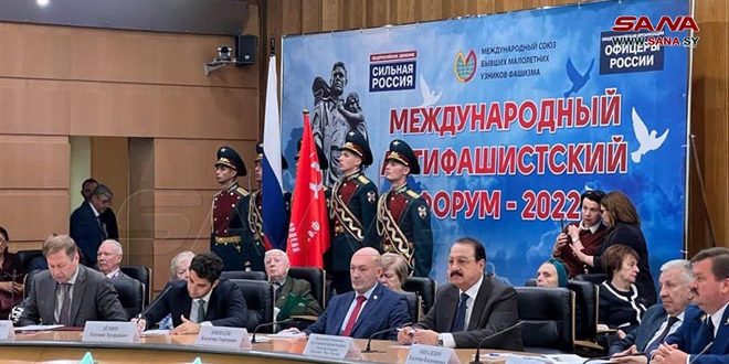 وقال السفير حداد في كلمة له اليوم أمام المنتدى الدولي لمناهضة الفاشية 2022 في موسكو: هناك وجه آخر للفاشية عانينا منه في سورية كثيراً وهو الإيديولوجيا التكفيرية الإرهابية وخطر الجماعات الإرهابية المتطرفة التي عاثت فيها فساداً وقتلت الأبرياء وشردت الأطفال والشيوخ من قراهم ومدنهم.