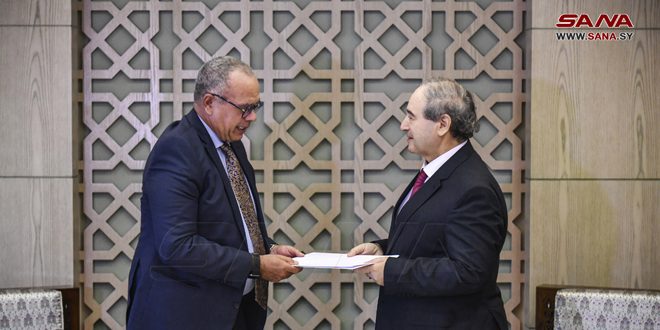 تسلم وزير الخارجية والمغتربين الدكتور فيصل المقداد اليوم نسخة من أوراق اعتماد السفير أندريه دوس سانتوس سفيراً مفوضاً فوق العادة لجمهورية البرازيل الاتحادية لدى الجمهورية العربية السورية.