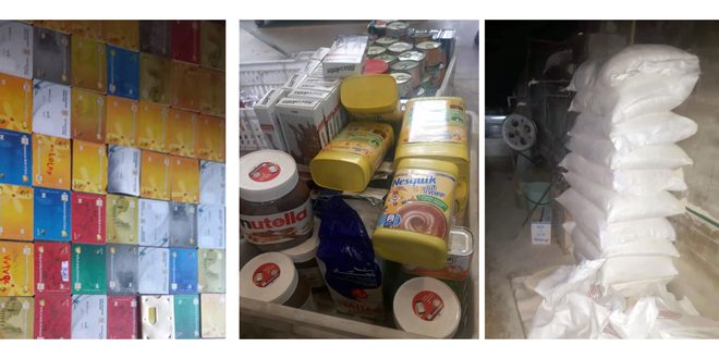 وأضاف زاهر أنه تم تنظيم ضبط تمويني بمخالفة حيازة والإتجار بمواد إغاثية غير مخصصة للبيع (أرز وزبدة الفستق) بحق محل لبيع المواد الغذائية في ريف جبلة وحيازة مواد غذائية وغير غذائية مجهولة المصدر وتصنيع ألبسة دون ترخيص وإنتاج دون بطاقة مواصفة في جبلة إضافة إلى 25 ضبطاً تموينياً بمخالفة عدم الإعلان عن الأسعار وعدم حيازة فواتير شراء لمواد المياه المعدنية والخضار والفواكه والمتة ومواد سمانة والبيض وألبسة وستائر وحقائب مدرسية ومكياجات ومواد غذائية و11 ضبطاً تموينياً لنقص في بطاقة البيان لعدة محال في أنحاء اللاذقية لافتاً إلى أنه تم سحب 13 عينة لمواد غذائية وغير غذائية لإجراء التحاليل اللازمة وبيان مدى مطابقتها للمواصفات القياسية.