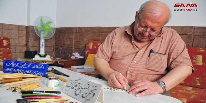 بقصبة صغيرة وقليل من الحبر رسم الرجل السبعيني هيثم قطان أجمل لوحات الخط العربي متخذاً من بيته الكائن في أحد أزقة منطقة وادي المشاريع بدمشق مشغلاً ومرسماً تشع منه الكثير من العبارات والكلمات المكتوبة بأجمل أنواع الخطوط العربية وفيها من الإبداع والدقة ما يجعل لكل حرف حكاية خاصة ترويها تلك اللوحات.