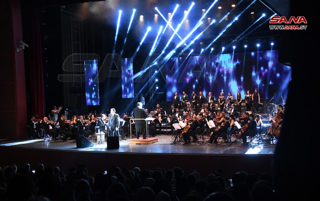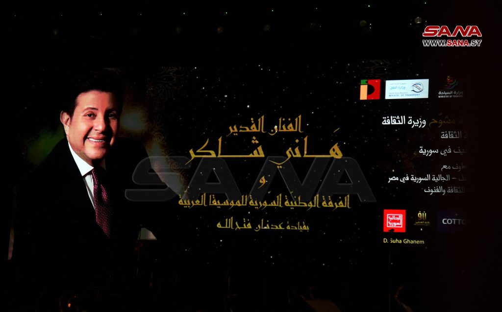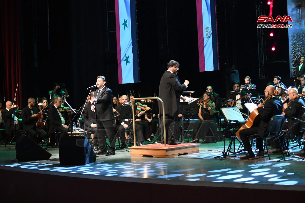 عربون المحبة بين الشعبين السوري والمصري الشقيقين كان عبر أغنية وطنية أطل بها فنان مصر الكبير في الأمسية التي استمرت على مدى ساعتين من الزمن بمرافقة الفرقة الوطنية السورية للموسيقا العربية بقيادة المايسترو عدنان فتح الله حملت عنوان (عاشت سورية… تحيا مصر) من كلمات الشاعر السوري صفوح شغالة وألحان الملحن المصري محمود الخيامي.
