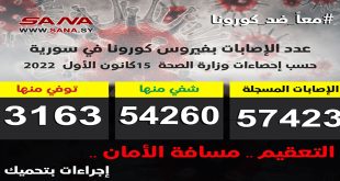 وأوضحت الوزارة في بيان تلقت سانا نسخة منه أن عدد الإصابات المسجلة في سورية بلغ حتى الآن 57220 شفي منها 53984 حالة وتوفي 3163 حالة.