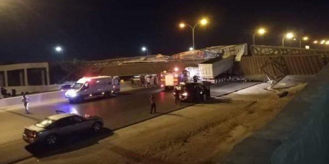 أصيب أربعة أشخاص إثر ارتطام شاحنة بجسر مشاة على طريق المطار وسقوطه على المركبات تحته فيما تم إغلاق الطريق في الاتجاهين.