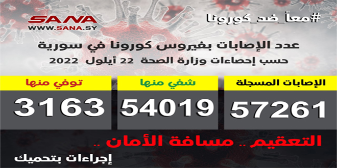 وأوضحت الوزارة في بيان تلقت سانا نسخة منه أن عدد الإصابات المسجلة في سورية بلغ حتى الآن 57261 شفيت منها 54019 حالة وتوفيت 3163 حالة.