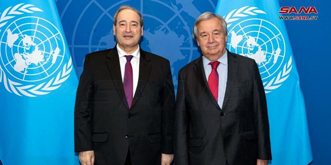 بحث وزير الخارجية والمغتربين الدكتور فيصل المقداد مع الأمين العام للأمم المتحدة أنطونيو غوتيريش عدداً من القضايا المطروحة على جدول أعمال المنظمة الدولية والتحديات التي تواجهها كما تناولا جوانب التعاون بين سورية والأمم المتحدة.