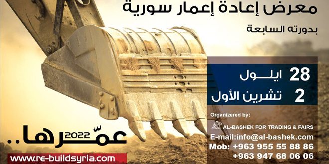 بمشاركة 167 شركة تمثل 17 دولة عربية وأجنبية ينطلق يوم الأربعاء المقبل معرض إعادة إعمار سورية بدورته السابعة عمرها 7 الذي يقام برعاية وزارة الأشغال العامة والإسكان وبتنظيم من مؤسسة الباشق للمعارض على أرض مدينة المعارض بدمشق ويستمر حتى الثاني من شهر تشرين الأول المقبل.
