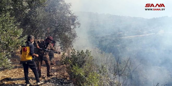 من عمليات إخماد حريق في قرية خربة الريح بريف طرطوس