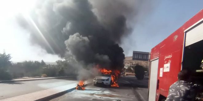 أخمد عناصر فوج إطفاء دمشق اليوم حريقاً اندلع ضمن سيارة فان لنقل الركاب على طريق المتحلق الجنوبي في دمشق.