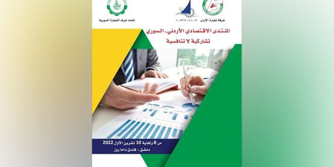 تحت عنوان (تشاركية لا تنافسية)، تنطلق يوم السبت القادم أعمال المنتدى الاقتصادي الأردني السوري، الذي تنظمه غرفة تجارة الأردن، بالتعاون مع اتحاد غرف التجارة السورية، برعاية وزارة الاقتصاد والتجارة الخارجية، وذلك في فندق داما روز بدمشق.