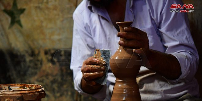 دمشق-سانا صناعة الفخار بأنواعها من التحف وقطع الزينة وأدوات الاستخدام اليومي يعمل بها الحرفي محمد …