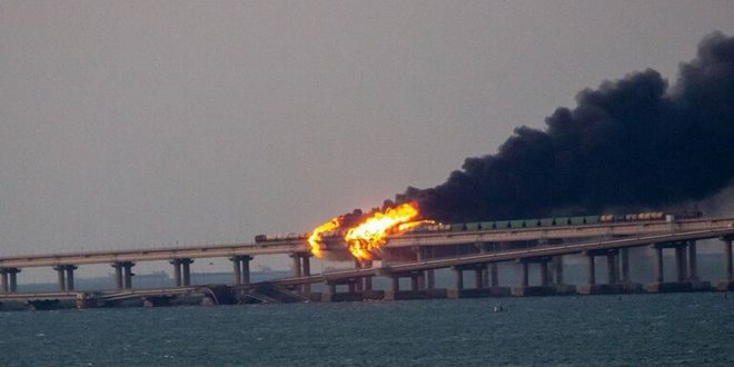 أعلنت اللجنة الوطنية الروسية لمكافحة الإرهاب أنه تم تفجير شاحنة على جسر القرم فجر اليوم، ما أدى إلى اشتعال النيران في عدد من صهاريج الوقود في قطار كان يسير عبر الجسر.