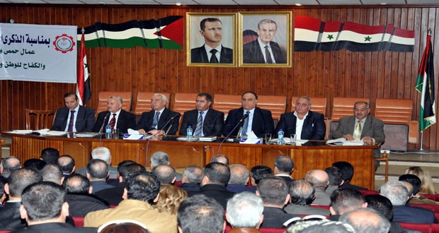 طالب أعضاء اتحاد عمال حمص خلال مؤتمرهم السنوي الأول للدورة النقابية السادسة والعشرين اليوم بدعم القطاع العام وتأمين مستلزمات تشغيل منشآته و إعادة النظر ببعض القرارات الاقتصادية لتحسين مستوى معيشة المواطنين ومكافحة الفساد ودعم ورعاية أسر الشهداء والجرحى جراء الأعمال الإرهابية.