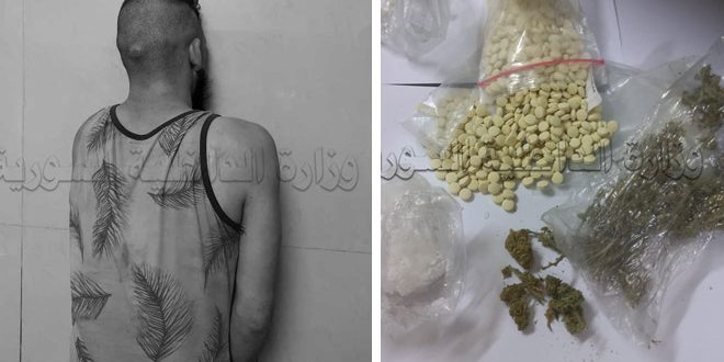 وذكرت وزارة الداخلية في بيان تلقت سانا نسخة منه أنه في إطار المتابعة المستمرة لإلقاء القبض على تجار المواد المخدرة ومروجيها، وبناء على المعلومات الواردة إلى فرع مكافحة المخدرات في دمشق، عن وجود شخص يقوم بترويج المواد المخدرة في دمشق، تم إلقاء القبض عليه بعد محاولته الهروب، وقيامه بإلقاء قنبلة على عناصر الدورية، وإصابة أربعة عناصر منها.