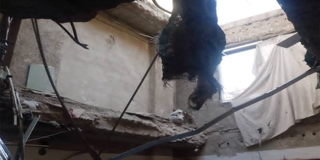 أصيب شخصان اليوم جراء انهيار سقف غرفة بمبنى مكون من ثلاثة طوابق بمنطقة زين العابدين بالمهاجرين في دمشق.