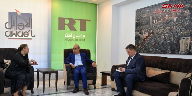 في إطار فعاليات الاجتماع الخامس السوري الروسي المشترك لمتابعة المؤتمر الدولي حول عودة اللاجئين والمهجرين السوريين، زار اليوم وفد روسي من وزارة التنمية الرقمية ووسائل الإعلام في روسيا مكتب قناة روسيا اليوم في دمشق، لبحث التعاون في مجال تدريب وتعليم الطلبة السوريين في المكتب.