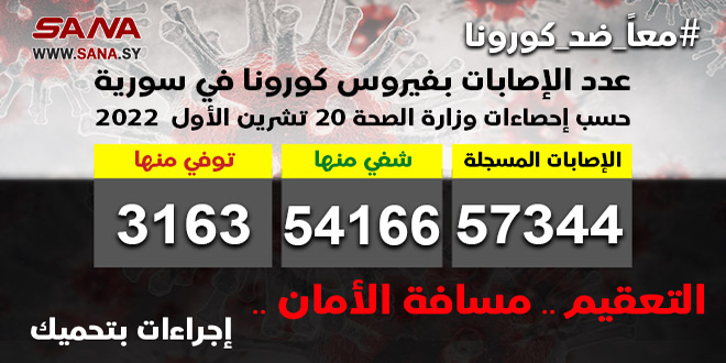وأوضحت الوزارة في بيان تلقت سانا نسخة منه أن عدد الإصابات المسجلة في سورية بلغ حتى الآن 57344 شفي منها 54166 حالة وتوفي 3163 حالة.
