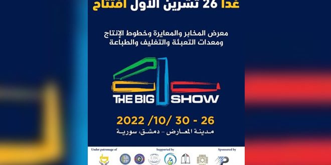 تنطلق غداً فعاليات معرض المخابر والمعايرة وخطوط الإنتاج ومعدات التعبئة والتغليف والطباعة “بيغ فور شو” وذلك في مدينة المعارض الجديدة بدمشق.