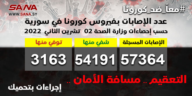 وأوضحت الوزارة في بيان تلقت سانا نسخة منه أن عدد الإصابات المسجلة في سورية بلغ حتى الآن 57364 شفي منها 54191 حالة وتوفي 3163 حالة.